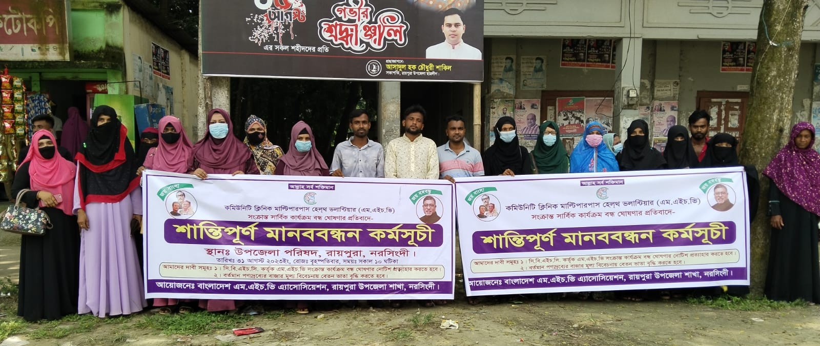 আজ বৃহস্পতিবার (৩১ আগস্ট) সকালে রায়পুরা উপজেলা পরিষদ মাঠে চাকরিতে বহাল ও স্থায়ী করণের দাবিতে মানববন্ধন করেন এমএইচভি সদস্যরা।