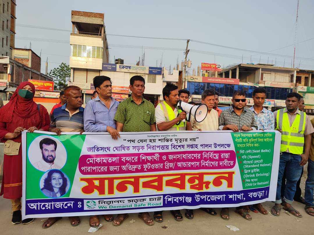 বগুড়ায় ফুটওভার ব্রিজ নির্মানের দাবিতে মানববন্ধন